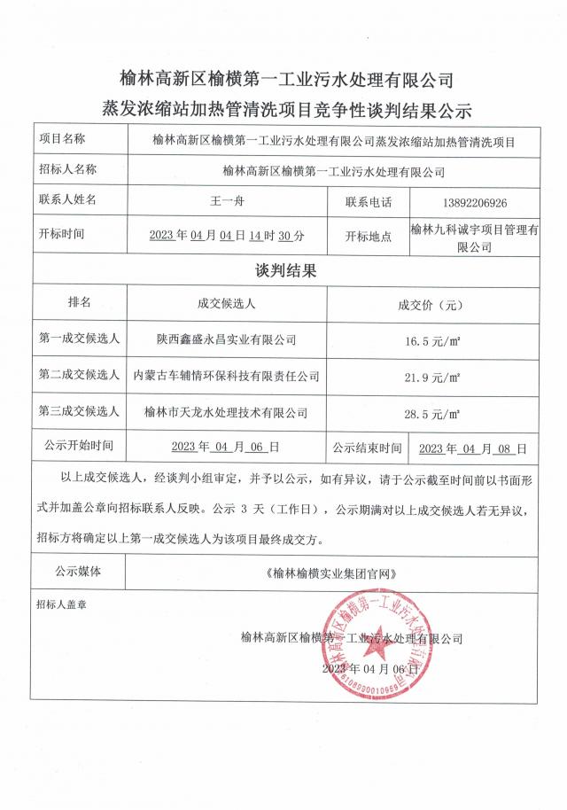 - 榆林高新區(qū)榆橫第一工業(yè)污水處理有限公司 蒸發(fā)濃縮站加熱管清洗項目競爭性談判結果公示
