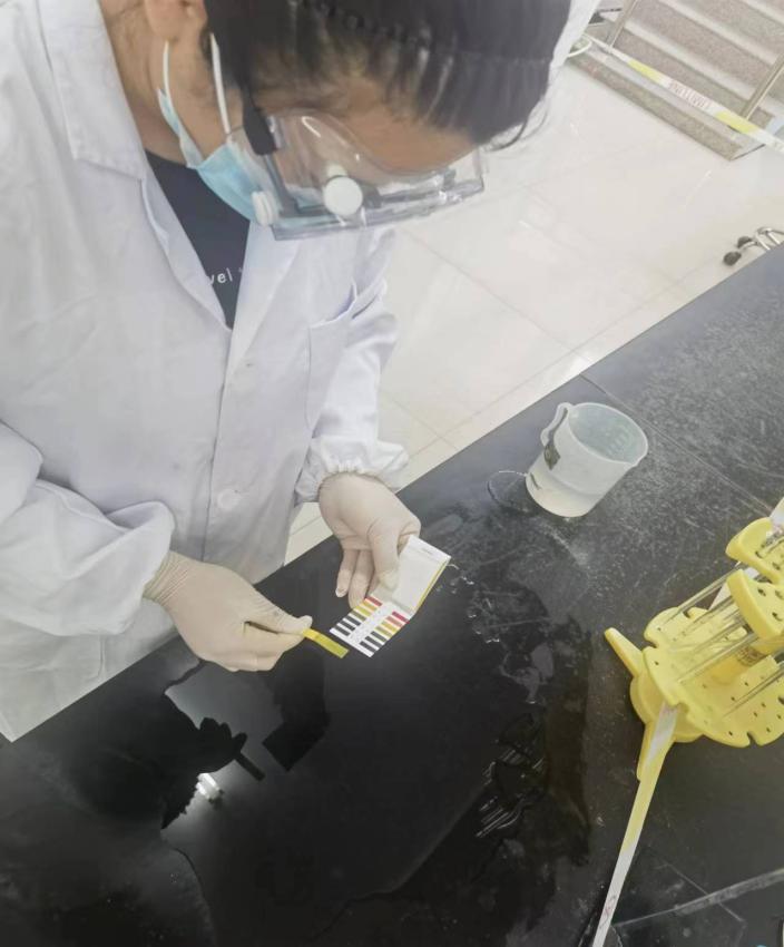 演練主要內(nèi)容為模擬實(shí)驗(yàn)室發(fā)生濃硫酸泄露致使化驗(yàn)員手部灼傷的場景。事故發(fā)生后,科室負(fù)責(zé)人立即啟動危險(xiǎn)化學(xué)品安全事故應(yīng)急處理預(yù)案進(jìn)行指揮救助處置。安排一人用濾紙或紗布等物品將傷者手上殘留的硫酸吸去,減去手套,用大量水沖洗,繼續(xù)用5%碳酸氫鈉溶液沖洗。其它人員負(fù)責(zé)現(xiàn)場硫酸的處理工作,拉起警戒線,并用堿石灰將散落的硫酸覆蓋,將石灰收集到一起。然后用水沖洗地面,測試廢水的PH值,合格后用抹布擦洗地面。事故警戒、應(yīng)急救援、泄露處置、環(huán)境恢復(fù)等工作緊張有序開展,受傷員工得到有效救護(hù),濃硫酸泄漏得到有效控制,未對環(huán)境和實(shí)驗(yàn)室安全運(yùn)行產(chǎn)生不良影響。