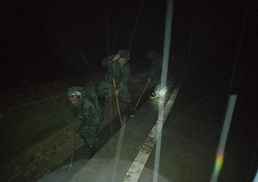 圖為:職工疏通排水溝道,確保雨水排水暢通。