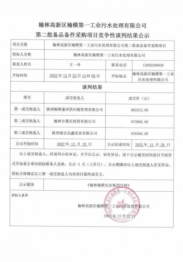 榆林高新區(qū)榆橫第一工業(yè)污水處理有限公司-榆林高新區(qū)榆橫第一工業(yè)污水處理有限公司第二批備品備件采購項(xiàng)目談判結(jié)果公示